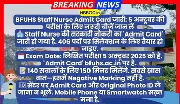 BFUHS स्टाफ नर्स भर्ती की लिखित परीक्षा 5 अक्टूबर 2025 को होनी तय हुई है. परीक्षा के दिन कोई गड़बड़ी न हो, इसलिए यूनिवर्सिटी ने 27 सितंबर 2025 को ही ‘Admit Card’ रिलीज़ कर दिया था. इस परीक्षा में सफल होने वाले उम्मीदवार ₹29,200 (7th CPC Pay Matrix) की शुरुआती सैलरी तक पा सकते हैं.