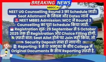 NEET UG Counselling 2025 Updates : जो Students NEET UG Exam Qualify कर चुके हैं और MBBS/BDS Courses में Admission का इंतज़ार कर रहे हैं, उनके लिए एक बहुत ज़रूरी और ताज़ा ख़बर आई है. Medical Counselling Committee (MCC) ने All India Quota (AIQ) Seats के लिए Round 3 Counselling का Schedule जारी कर दिया है. Round 1 और Round 2 में जिन्हें Seat नहीं मिल पाई थी या जो अपनी Seat Upgrade कराना चाहते हैं, उनके लिए यह एक आख़िरी बड़ा मौका है. मैं आपको बता दूं कि Round 3 के लिए Registration कल, यानी 29 September 2025 से शुरू हो रहे हैं.