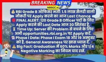 RBI Grade B Officer Recruitment : देश के Central Bank, Reserve Bank of India (RBI) में Officer बनने का सपना देख रहे नौजवानों के लिए एक आखिरी Alert है. Grade B Officers के पदों पर भर्ती के लिए ऑनलाइन Apply करने की Last Date आज ही है. मुझे पता है, RBI की नौकरी का रुतबा, Salary और सुरक्षा कितनी बड़ी बात होती है. एक नए की Gross Monthly Emoluments (बिना ) क़रीब ₹1,50,374 होती है! अगर आप योग्य हैं और आपने अभी तक फॉर्म नहीं भरा है, तो आपके पास अब सिर्फ़ कुछ ही घंटे बचे हैं. आज सितंबर 2025 को Application Window बंद हो जाएगी.