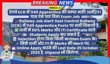 RRC ECR Apprentice Recruitment 2025 : रेलवे में नौकरी या Training की तलाश कर रहे युवाओं के लिए एक बहुत अच्छी ख़बर आई है. East Central Railway (ECR) ने Apprentice की 1149 Posts पर भर्ती निकाली है. ये मौका उन Students के लिए बहुत शानदार है जो 10वीं Pass हैं और उनके पास ITI का Certificate है. सबसे अच्छी बात ये है कि Railway में Apprentice करने से आपको आगे आने वाली Group D जैसी भर्तियों में फ़ायदा मिलता है. इस Recruitment के लिए Registration Process 26 September 2025 से शुरू हो चुकी है, और आपको Online Apply करना है.